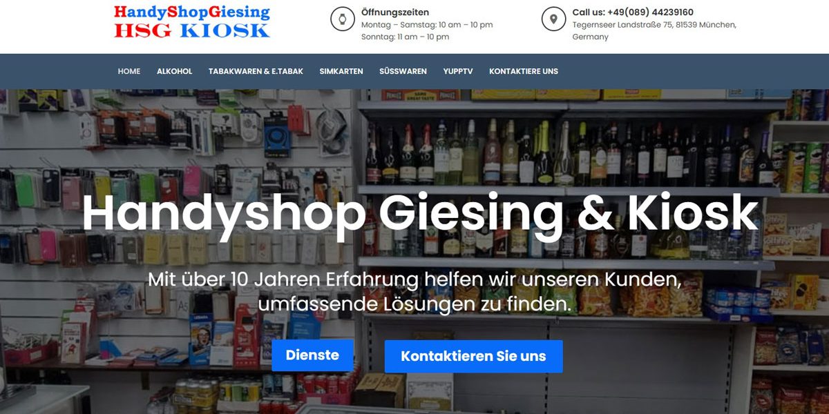 Handyshop Giesing & Kiosk has been serving local customers for over 6 years in Germany Category: WebsiteMay 1, 2023 Share This Project Share on FacebookShare on Facebook Share on XShare on X Pin itShare on Pinterest Share on LinkedInShare on LinkedIn Project navigationPreviousPrevious project:Bespoke Driveways and PatiosNextNext project:Prime Paving and Masonry